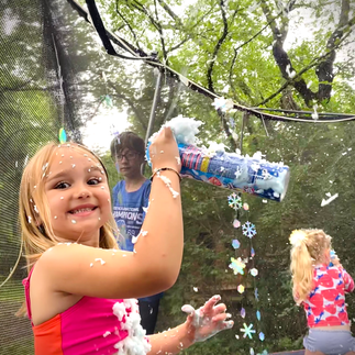 Ice Palace- We decorated our trampoline with hanging iridescent snowflake garland to make it look like an ice palace. Using a combination of water, and a bubble solution and wand kit with the leaf blower, the kids had a bubble party! This blue foam spray was also used to add in to the fun. Kiddos collected a Snowflake Candy Bracelet at this station to add to their treat bag.